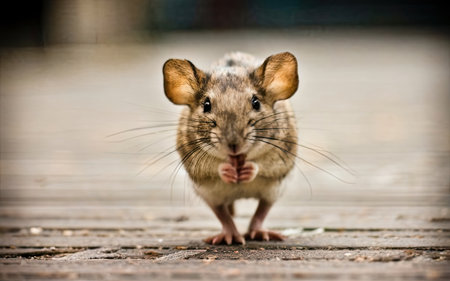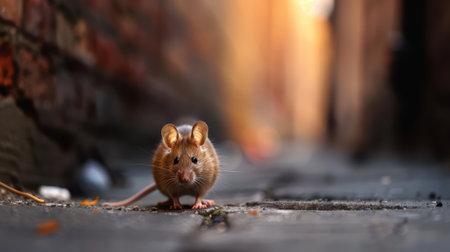 A detailed close-up of a mouse on a city street, with a blurred background and warm lighting, capturing the essence of urban wildlife.