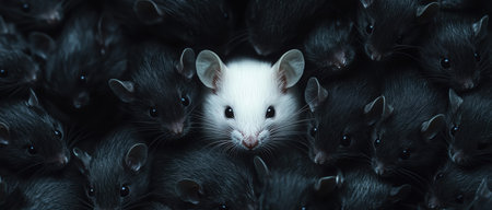 A single white rat stands out among many black rats, symbolizing uniqueness or difference.