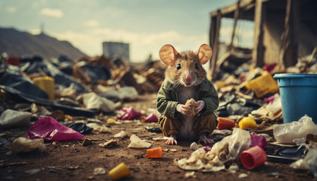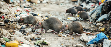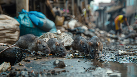 In an open slum, several rats scavenge among the piles of garbage, highlighting the struggles of urban life and waste issues. The cluttered ground is filled with debris.