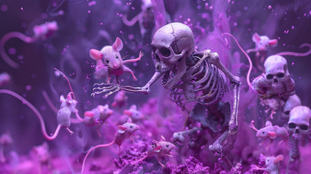 Skeleton Animated in an Enchanted Fantasy World with Mystical Mice in Purple Atmosphere