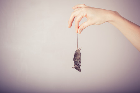 A hand is holding a dead mouse by it's tail