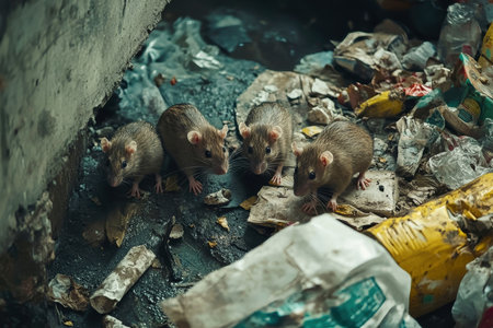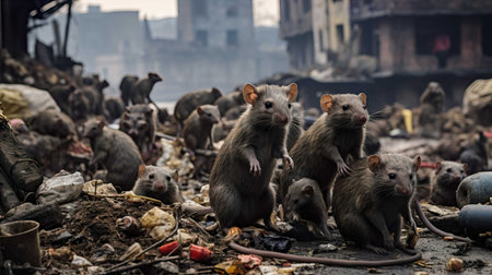 A group of curious rats searches for food amid discarded refuse on a bustling city street. Their sleek bodies navigate through a chaotic landscape of waste.