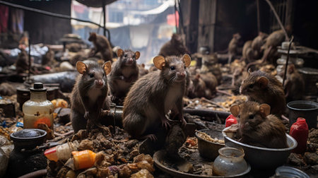In a vibrant yet grimy slum, several rats scavenge through heaps of garbage, showcasing their natural behavior in a chaotic urban setting, revealing a raw moment of survival.