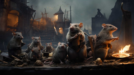 Medieval battle scene with rats. Creative artwork decoration. 3D Rendering