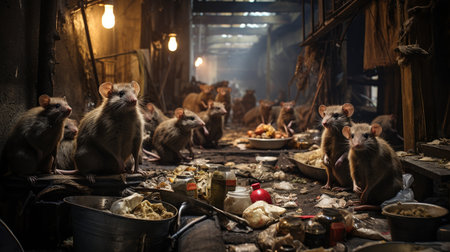 In a grimy basement, a group of rats searches for remnants of food among the heaps of discarded trash, highlighting a dismal and unsanitary environment.
