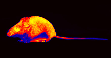 Rodentia, mouse and volume close-up. Illustration of thermal image wood mouse shooting from different angles. A on a black background isolated