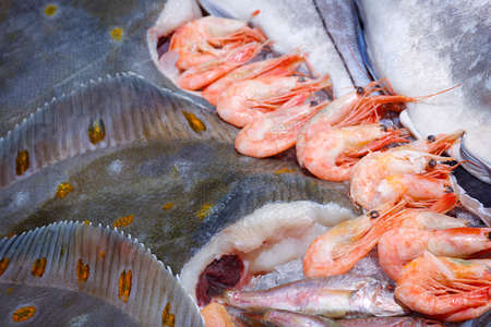 Seafood - Flounder and oysters lie on the counter on ice in store. Copy space. Selective focus.