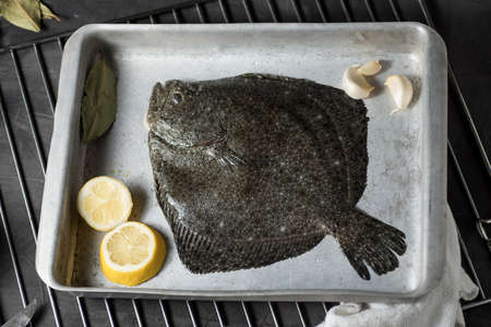 Turbot on a baking sheet and oven rack, with garlic, lemon and bay leaf, prepared to be baked in the oven