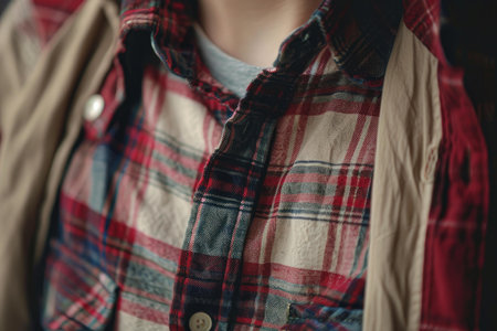 Detailed view of a person wearing a trendy plaid shirt under a vest, with a focus on fabric texture