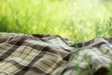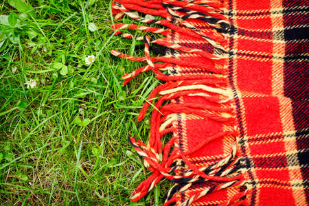 Red and white plaid picnic blanket on top of a green field in sunny day on grass of lawn in summer park. Blurred Background.