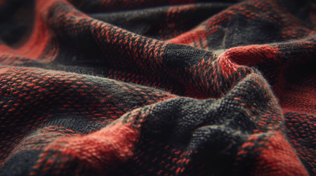 A close-up image shows the detailed texture of a red and black plaid blanket with white stripes. The blanket is folded and draped in a way that reveals the intricate woven patterns and fuzzy texture of the fabric.