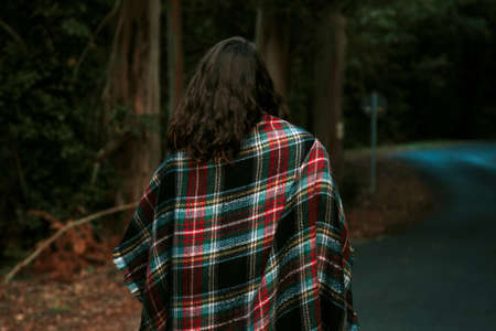 Romantic woman in a warm sweater with a plaid on her shoulders on nature in the mountains