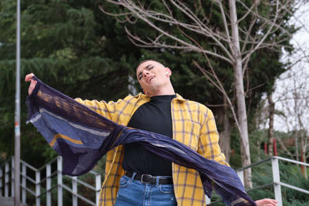 Young non binary person dancing and singing in the street. Make up androgynous person.