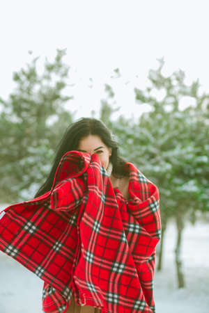Happy woman laughs outdoors in the forest near coniferous trees and a plaid on her shoulders