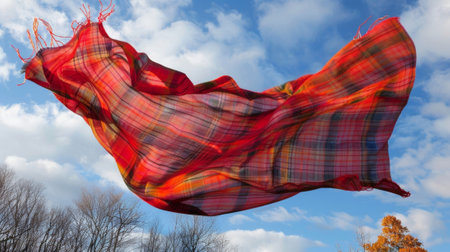 A red plaid blanket being tossed high in the air the pattern resembling a tornado