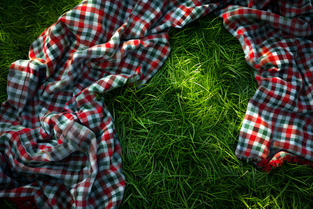 A checkered blanket lies spread out on lush green grass, illuminated by sunlight. the vibrant colors and natural setting evoke a sense of relaxation, leisure, and connection with nature, perfect for a picnic or outdoor gathering. Generative AI