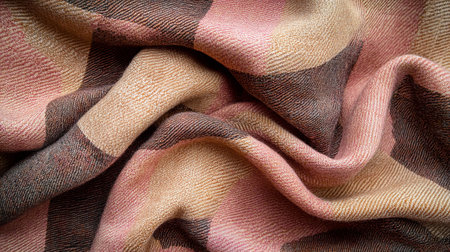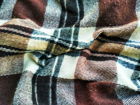 Wrinkled plaid blanket with geometric pattern on a white table. Empty space for copy. Brown folded corner for lifestyle purposes. Soft woolen material for cold weather. Warm and cozy textile feeling.