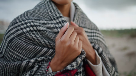 Closeup woman chest walking windy beach. African american hands adjusting scarf getting warm on cold weather. Calm beautiful woman strolling relaxing alone. Peaceful tourist feeling comfy on trip