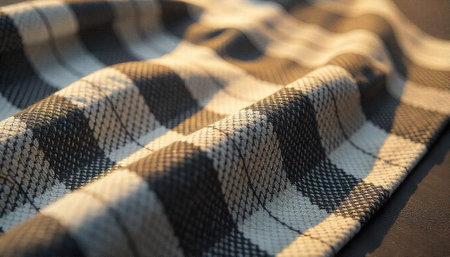 A detailed close-up of plaid flannel fabric, illuminated by soft sunlight, evokes a cozy autumn atmosphere. The minimal aesthetic highlights the texture and warmth of the material.