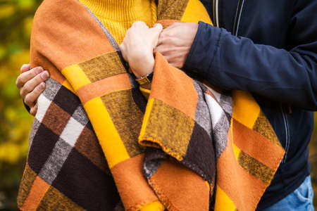 A man hugs a woman by the shoulders, which are covered with an autumn plaid. Horizontal photo