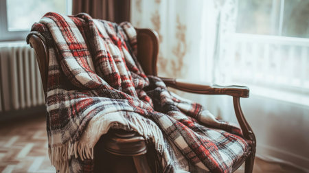 A beautifully arranged armchair with a soft flannel blanket creates a cozy atmosphere, perfect for relaxation in a sunlit room with elegant decor.