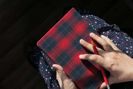 Close-up of red and blue checkered blanket against blurred autumn forest. Generative AI