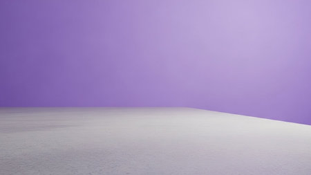 A minimalist composition featuring a smooth, light gray concrete surface that recedes into the distance. Behind the surface is a soft, solid purple background. The lighting is even and gentle, creating a clean and airy feel. This scene is designed for simplicity and versatility, offering a neutral yet visually appealing backdrop product or abstract compositions.