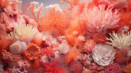 Ultra-detailed coral reef texture, vibrant branching formations in pinks, purples, and oranges.