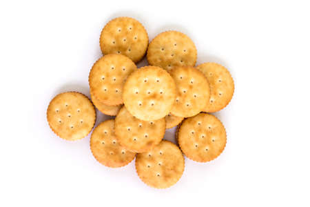 Crispy round crackers on white background. Dry crunchy cookies. Studio shot.