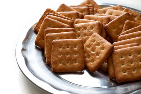 A bunch of cream crackers arranged in a circle. Selective focus points. Blurred background