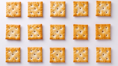 Square crackers arranged in a grid pattern on a white background. Food and snack concept