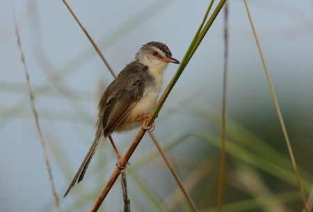 Grey-breasted Prinia perching on grass stalk puffing up its plumage
