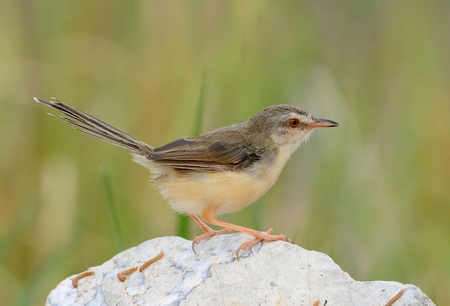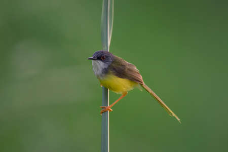 Prinia flaviventris, lovely yellow with grey face and long tail bird lovely standin gon wooden branch expose over green grass