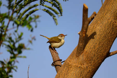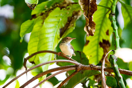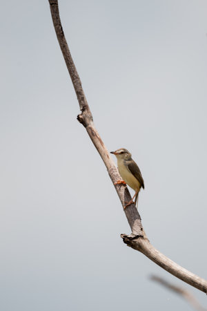 A plain prinia is perching on a dry wood branch bathin sunlight in the morning.