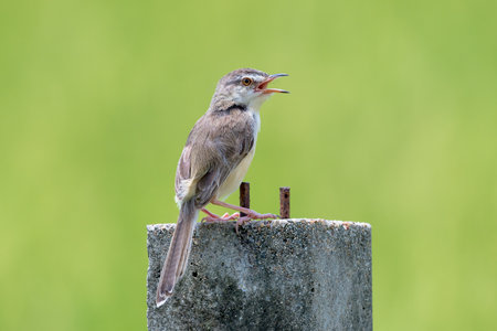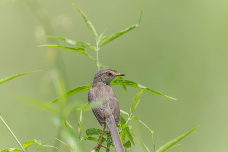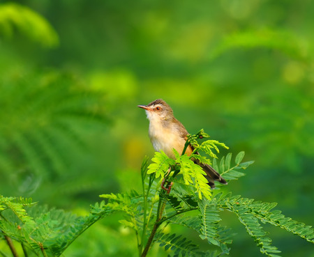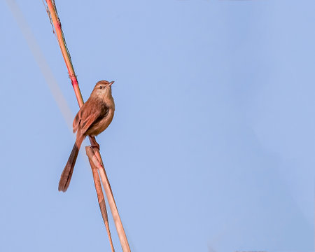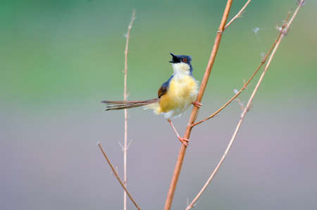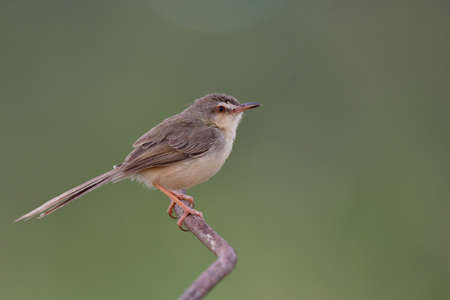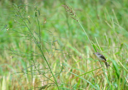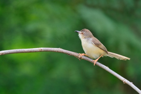 Little brown with beautiful long tail sitting on stick over find blur green background, plain prinia