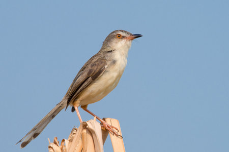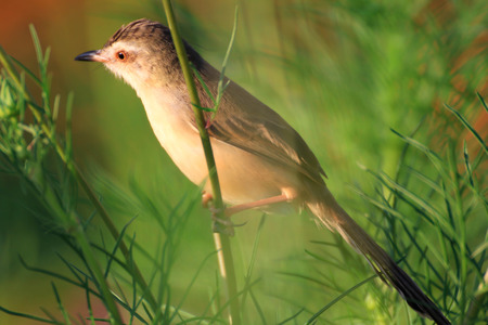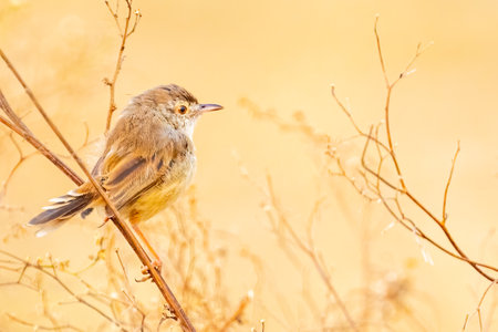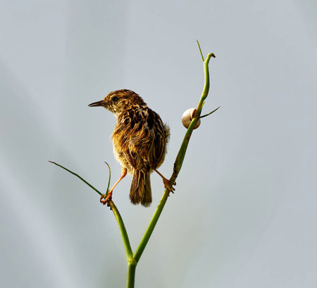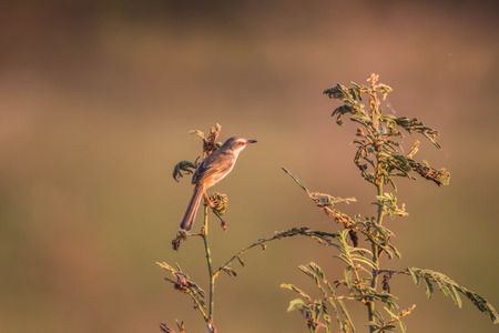 Shot of a Plain Prinia, or the Plain, or White-browed, Wren-Warbler perched on a throne branch in early morning light