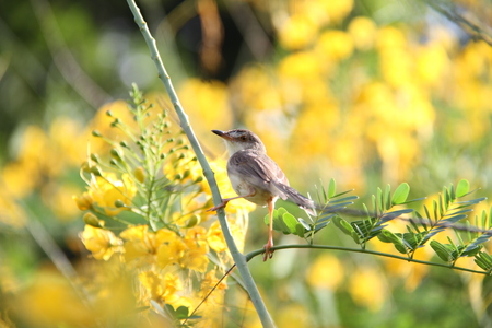 Yellow-bellied Prinia or Yellow-bellied Wren-warbler(Prinia flaviventris), beautiful yellow bird on branch with green background.