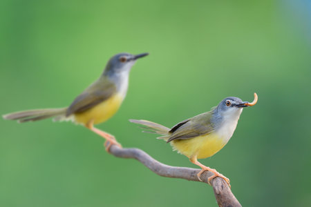 pair of yellow-bellied prinia foraging together in find morning, beautiful birds in nature