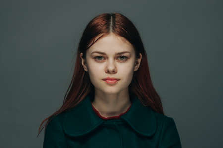 portrait of a red-haired woman on a gray background in dark clothes makeup model