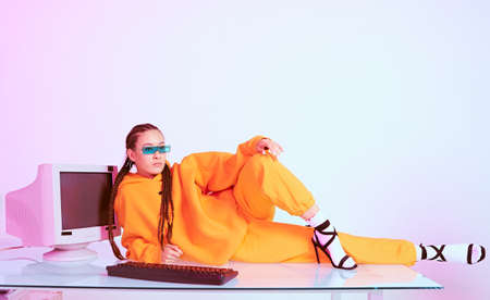 Stylish asian female office worker in sunglasses laying on table with obsolete computer. Colored Neon light