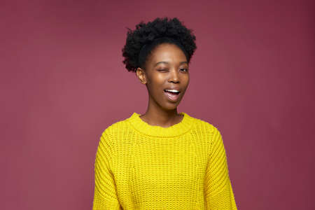 Stylish positive optimistic young african american girl winking eye, flirting, having good idea, studio headshot