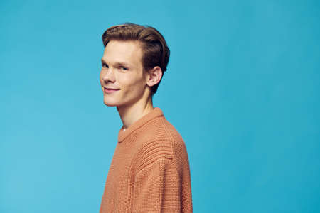 portrait of a cute guy on a blue background in a yellow T-shirt