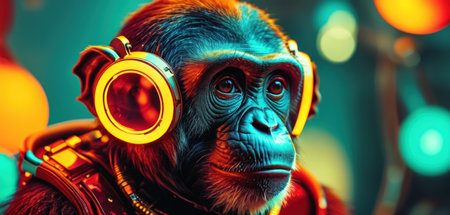 Chimpanzee listening to music with headphones on dark background.