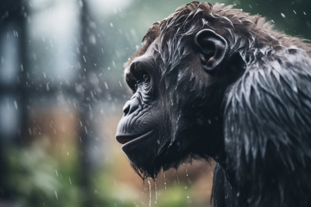 black fur of a gorilla wet with mist