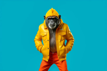 monkey posing with orange sunglasses and matching jacket on the outside, anthropomorphic concept