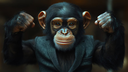 Chimpanzee in suit, flexing muscles, dark background, confident