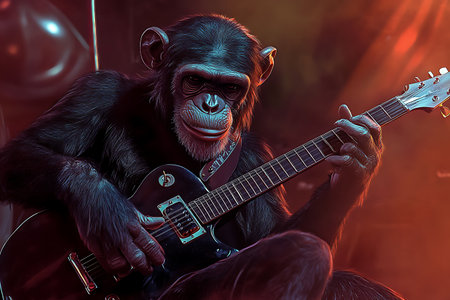 Chimpanzee with electric guitar on a dark background. 3d rendering