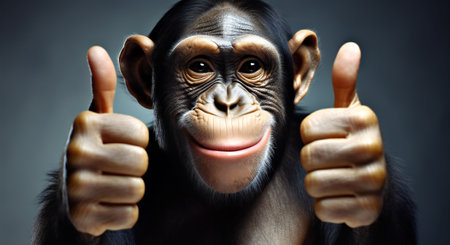 Portrait of friendly monkey showing thumb up while smiling and looking at the camera.