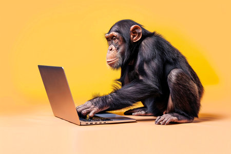 A focused chimpanzee typing on a laptop, seated against a bright yellow background, appearing engaged. Generative AI