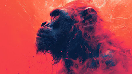 Chimpanzee in a red liquid. Red and black colors.